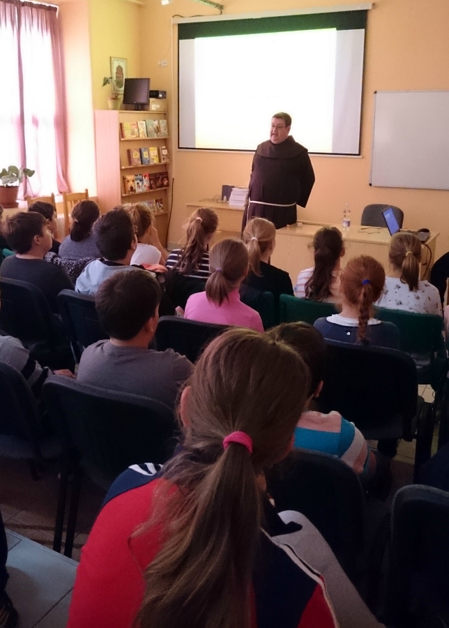 A szentmise után József atya előadásokat tartott az osztályoknak a ferences rendről, az iskolánk ferences múltjáról és a szerzetesi hivatásról.